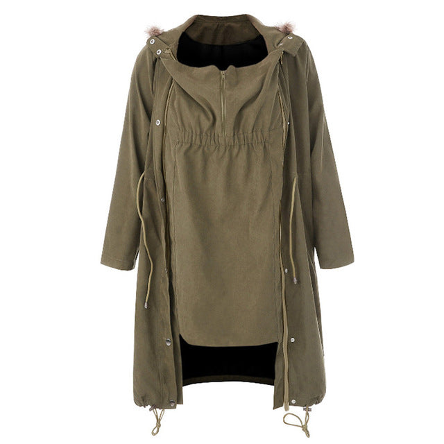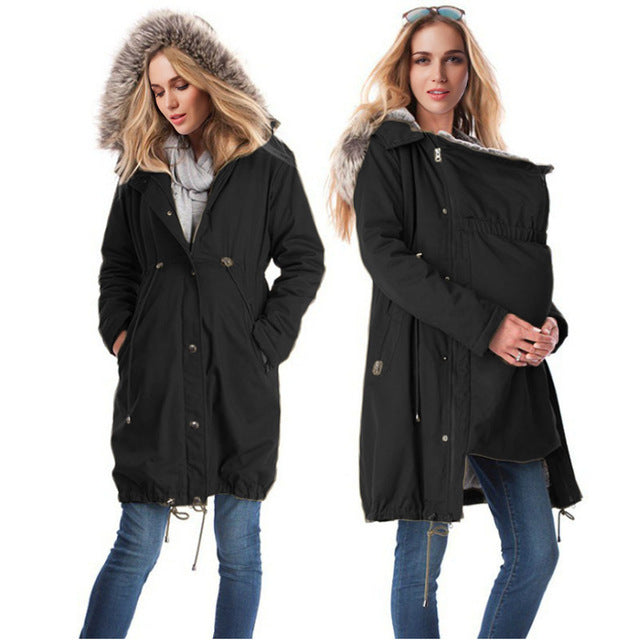 Stay warm, stylish, and comfortable throughout your pregnancy with this elegant maternity coat. Designed with a soft fur collar and a windbreaker silhouette, it provides extra warmth and a flattering fit for expecting mothers. The cotton-blend fabric ensures breathability and comfort, while the classic colors make it versatile for both casual outings and special occasions.